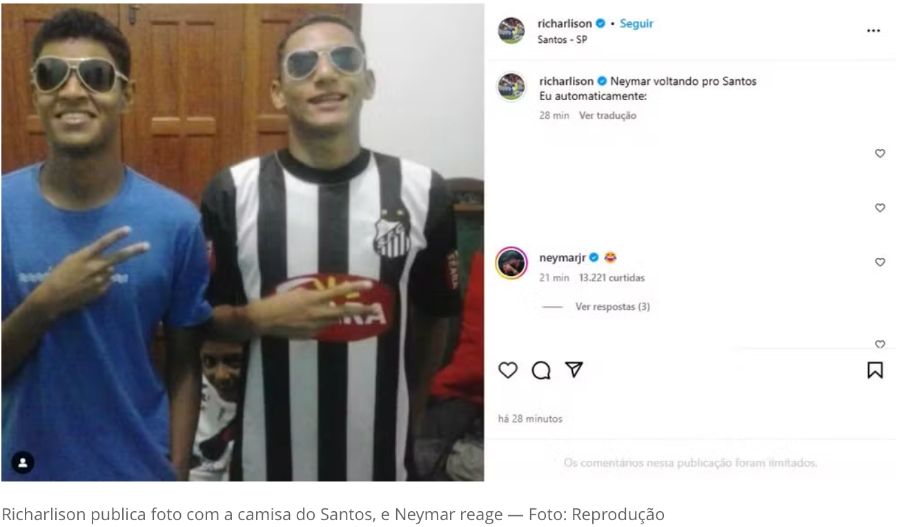 O retorno próximo de Neymar ao Santos repercute mundialmente e fez Richarlison publicar uma foto antiga com a camisa do Peixe. Em seu Instagram, o atacante do Tottenham, da Inglaterra, e passagens pela seleção brasileira fez o craque reagir com um emoji rindo.