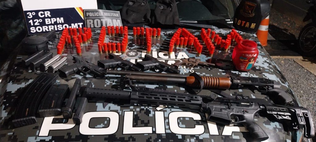 Policiais militares do Batalhão de Rondas Ostensivas Tático Móvel (Rotam) prenderam dois homens, de 23 e 22 anos, por porte ilegal de arma e associação criminosa, na noite deste domingo (28.04), em Sorriso. Na ação, foram apreendidas sete armas de fogo que seriam pertencentes a uma facção criminosa da cidade.