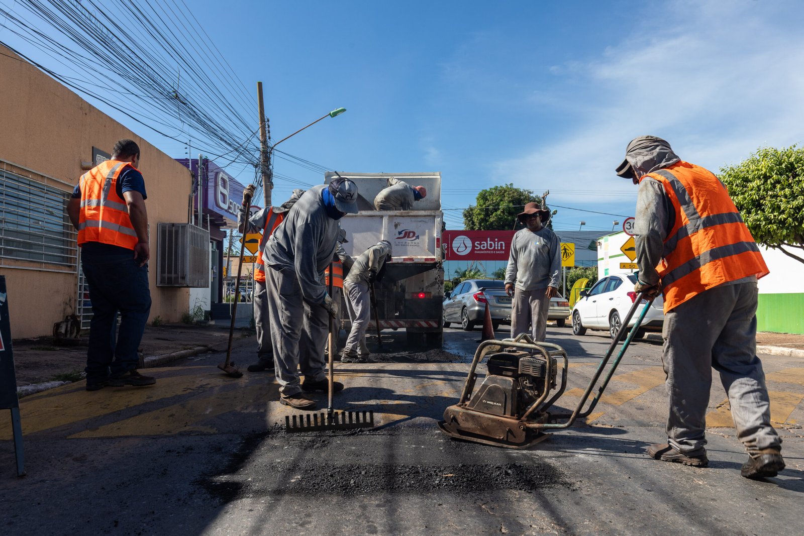 A imagem mostra as equipes da Secretaria Municipal de Obras Públicas realizando a operação tapa-buraco no bairro CPA II.