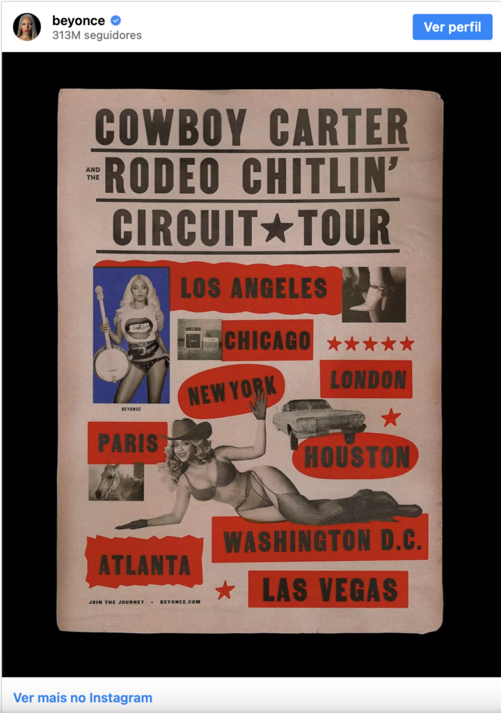Sem Brasil no mapa, a cantora americana Beyoncé anunciou as cidades que receberão apresentações da turnê de Cowboy Carter. Veja abaixo.