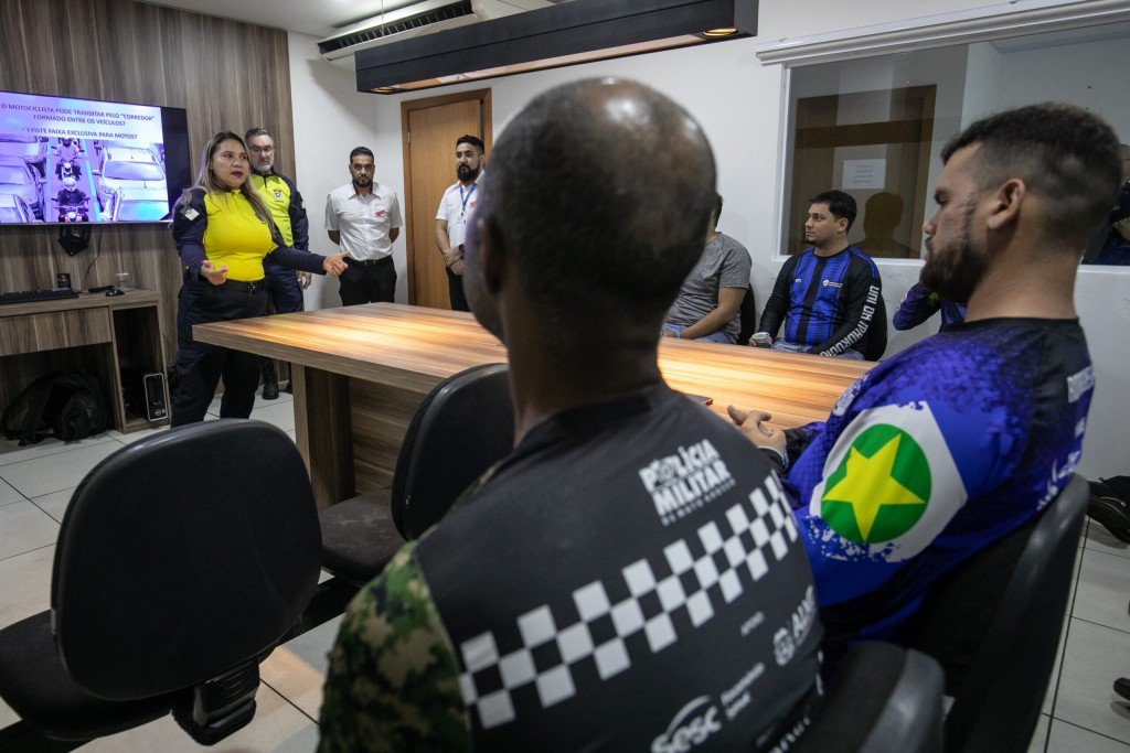 “É importante que todos saibam que a faixa exclusiva de ônibus teve uma pacificação, em outras palavras, só é proibido trafegar nela nos horários de pico, entre 6h e 8h da manhã. A mesma situação que se repete é no final do dia, das 17h às 19h, quando também é proibido. Fora desses horários, está permitido trafegar na faixa exclusiva de ônibus. A mesma coisa acontece com a faixa exclusiva de bicicleta, que precisa ser respeitada, não podendo estacionar nela. É preciso respeitar os ciclistas, manter a distância lateral deles”, contextualizou a instrutora do curso aos 30 participantes.