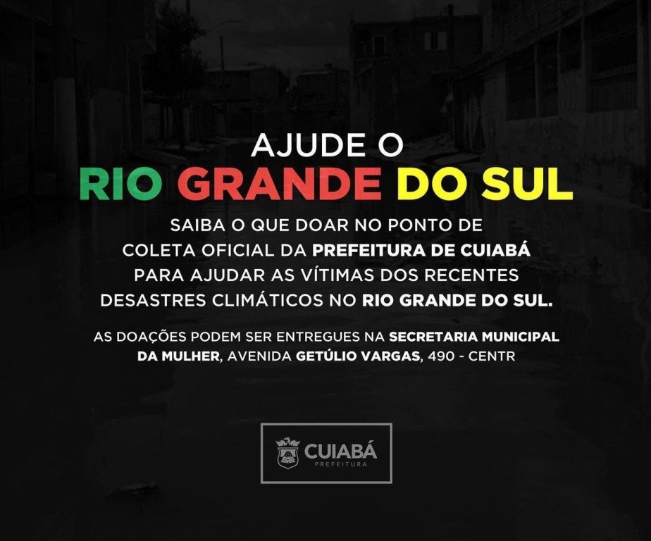 Para ajudar as vítimas da enchente no Rio Grande do Sul, a Prefeitura de Cuiabá instalou um ponto de coleta que funciona na sede da Secretaria Municipal da Mulher (Avenida Getúlio Vargas, 490, Cuiabá).