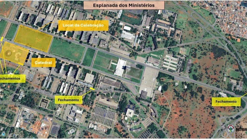Os acessos ao estacionamento da Catedral serão fechados a partir das 23h59 desta quarta-feira (29). Nesse horário, serão interditados ainda os acessos aos blocos A e B da Esplanada dos Ministérios. A via de ligação N1/S1, na altura do Museu da República, também será fechada, sendo reservada para o estacionamento de táxis. Os agentes do Detran-DF ainda farão o bloqueio de três faixas das vias N1 e S1, do Eixo Monumental, próximas ao canteiro central, no trecho do quadrante em frente à Catedral. As demais faixas permanecerão liberadas para o tráfego de veículos.