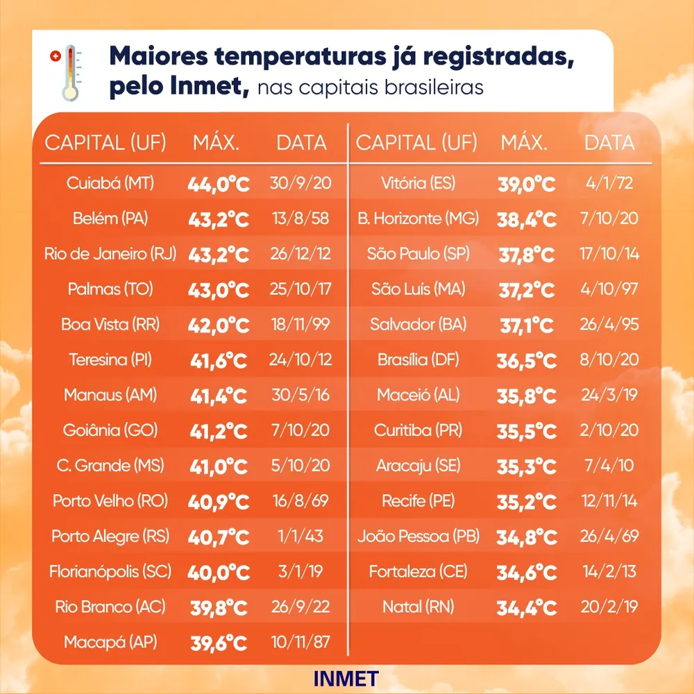 No começo desta semana, o Inmet divulgou a série histórica com as maiores temperaturas já registradas em cada uma das capitais:
