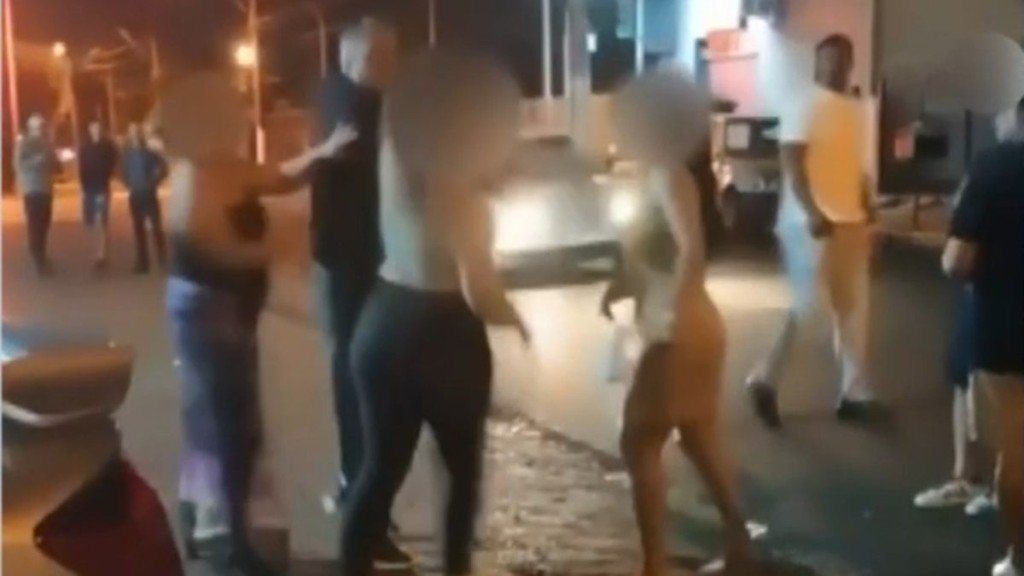 No vídeo, é possível ver que a mulher, de 41 anos, discute com o homem ao lado de uma amiga. Uma terceira pessoa se aproxima para separar os três.