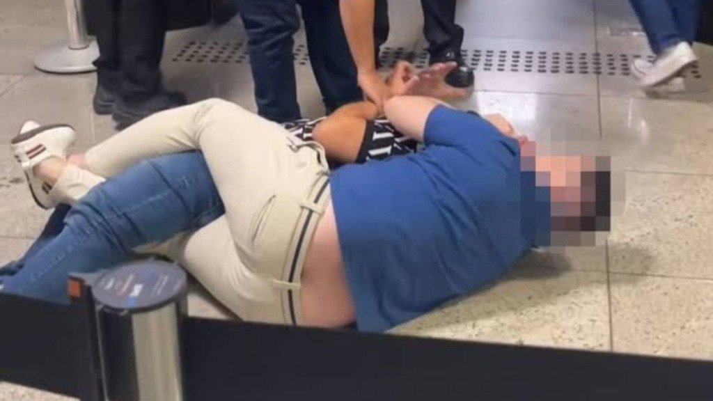 Um dos passageiros que estava na fila gravou a briga dos dois. Os homens aparecem atracados no chão, já na área de embarque. Um imobiliza o outro.